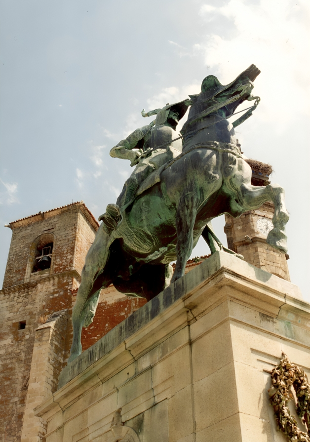 En su centro se alza el símbolo indiscutible de la ciudad: la estatua ecuestre de Francisco Pizarro, realizada en bronce por el escultor estadounidense Charles Cary Rumsey en 1925 y de seis mil quinientos kilos de peso. Es una imagen poderosa: Pizarro, sobre un caballo cubierto con armadura, apuntando hacia un horizonte que un día quiso conquistar. La obra, donada a Trujillo, tiene una réplica exacta en Lima, recordando el vínculo transatlántico entre ambas ciudades.