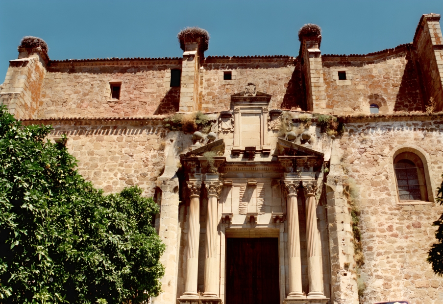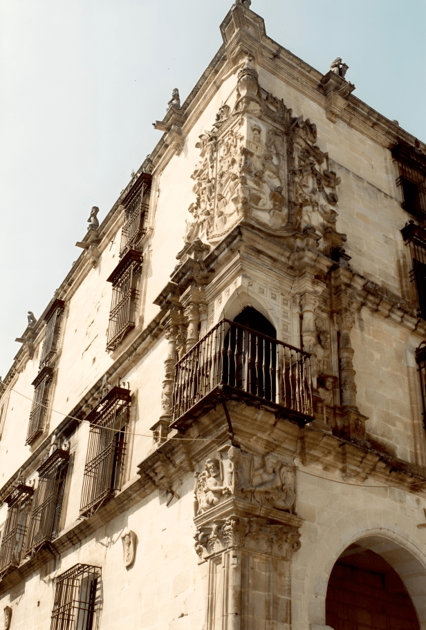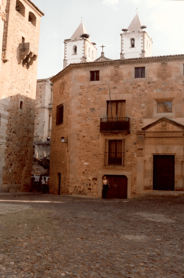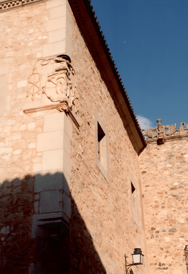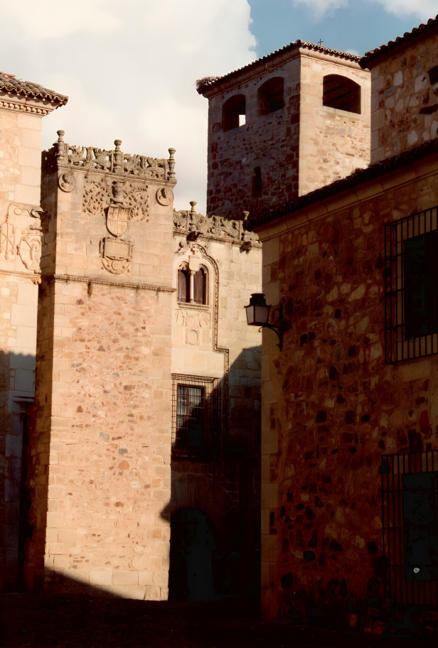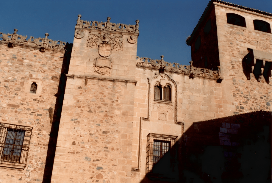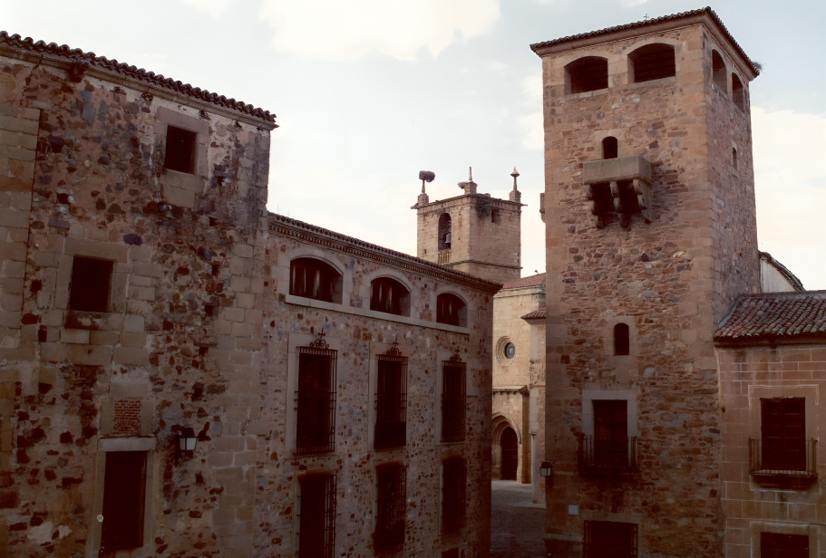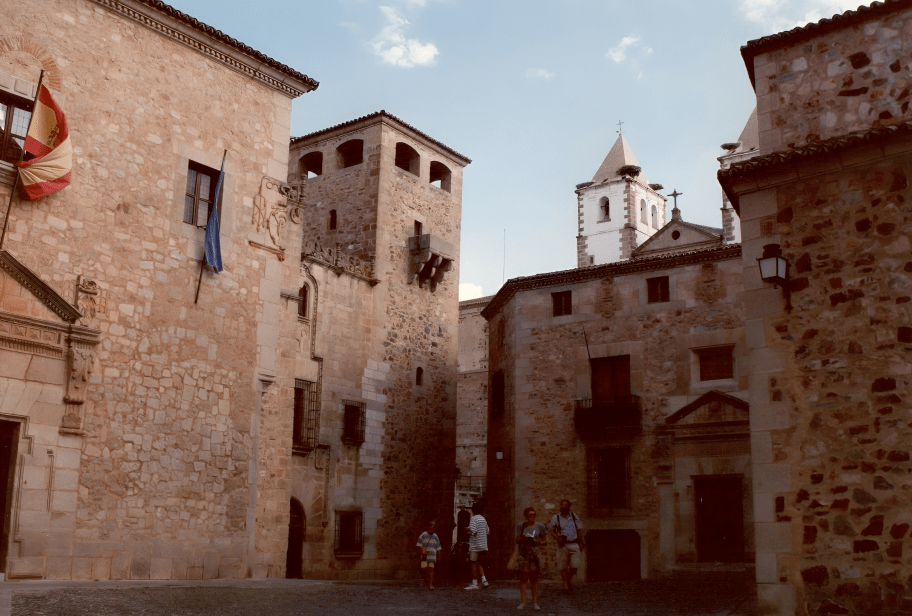 Desde la plaza se contempla un conjunto de palacios que forman un collar de piedra renacentista. El Palacio de los Duques de San Carlos, con galería porticada plateresca. El Palacio del Marqués de la Conquista, con su famoso balcón de esquina, mandado construir por Hernando Pizarro, hermano del conquistador.