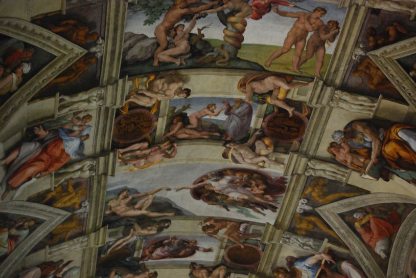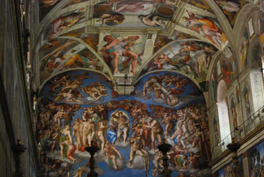 … Y Miguel Ángel, que pintó el techo de la capilla por encargo de Julio II de mayo de 1.508 a noviembre de 1.512. La dificultad que representaba la amplitud y la desnudez de las superficies de la bóveda fueron brillantemente superados por este genio al sobreponer a la arquitectura real una estructura arquitectónica diseñada en la que colocó, con maravillosos efectos tridimensionales, los distintos elementos figurativos. Impresionante esta maravilla del arte incluso para un profano y para las condiciones de la visita: sin casi luz y con un gentío que la abarrota en cualquier momento del día.