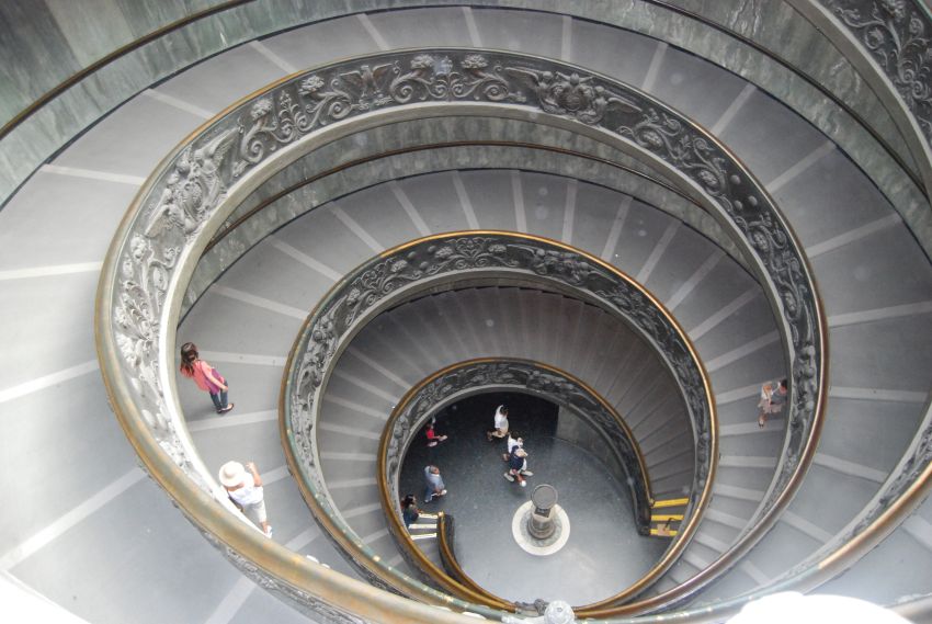 Después de deambular por la Biblioteca Vaticana y por otra cantidad ingente de salas abandonamos a media tarde esta impresionante colección de arte a media tarde por la espectacular Escalera elíptica, realizada por Giuseppe Momo en 1.932.