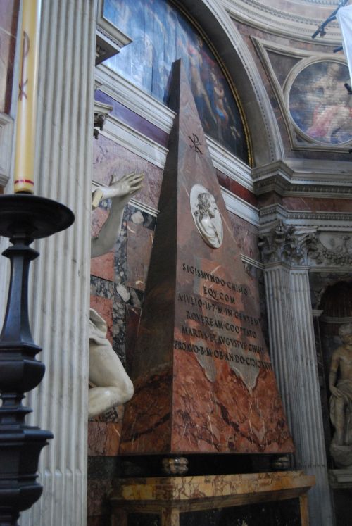 Una gran lona nos impidió observar todos los detalles descritos en el libro: la cúpula, adornada por las numerosas estrellas, los 7 planetas del sistema solar, la representación de los signos zodiacales, las 4 estaciones del año, los 4 elementos naturales; Entre las ventanas, pinturas que representan la creación y el pecado original, y sobretodo las 2 enormes pirámides de mármol que se encuentran a los lados. En el centro de la capilla, en el mosaico en el suelo, el famoso “Hueco del diablo”, que representa a la muerte alada. Nos quedamos sin ver la famosa escultura de Bernini “Habacuc y el Ángel” y el dedo del ángel, indicando la dirección hacia el próximo Altar de la ciencia.