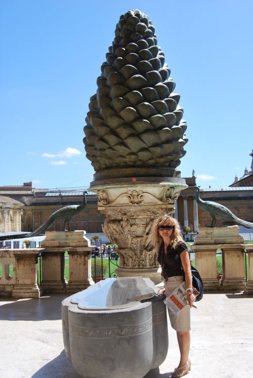 Pronto dimos con la Cortile della Pigna, una enorme piña de bronce, parte de una antigua fuente romana que una vez estuvo en el patio del antiguo San Pedro.