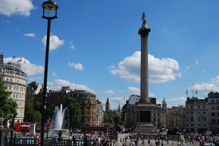 A pesar de la hora, Trafalgar Square era un auténtico hervidero de gente. Esta plaza fue diseñada en 1820 como monumento al almirante Horatio Nelson, héroe británico cuya estatua (tres veces su tamaño real) está sobre una columna de 52 metros.