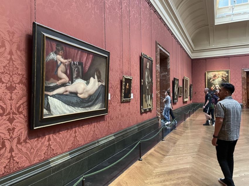 Del Barroco, Rococó, Neoclásico y Romanticismo se pueden encontrar obras como Cena en Emaús de Caravaggio, la Venus del Espejo de Velázquez, Dama tocando el virginal de pie de Vermeer, Sr. y Sra. Andrews de Gainsborough, El carro de heno de Constable y El Temerario remolcado al dique seco de Turner.
