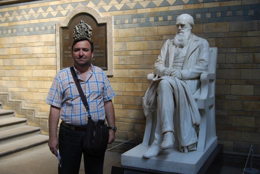 Una estatua de Charles Darwin preside este inmenso salón desde el descanso de la escalera que conduce a las plantas superiores del museo.