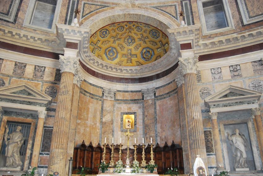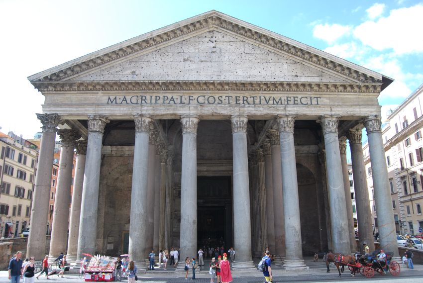 Su pórtico, sus puertas de bronce, su solemne cúpula, sus capillas, en una de las cuales se encuentra la tumba en la que yacen los restos mortales de Rafael, hacen de él el más perfecto de entre los monumentos clásicos existentes en Roma.
