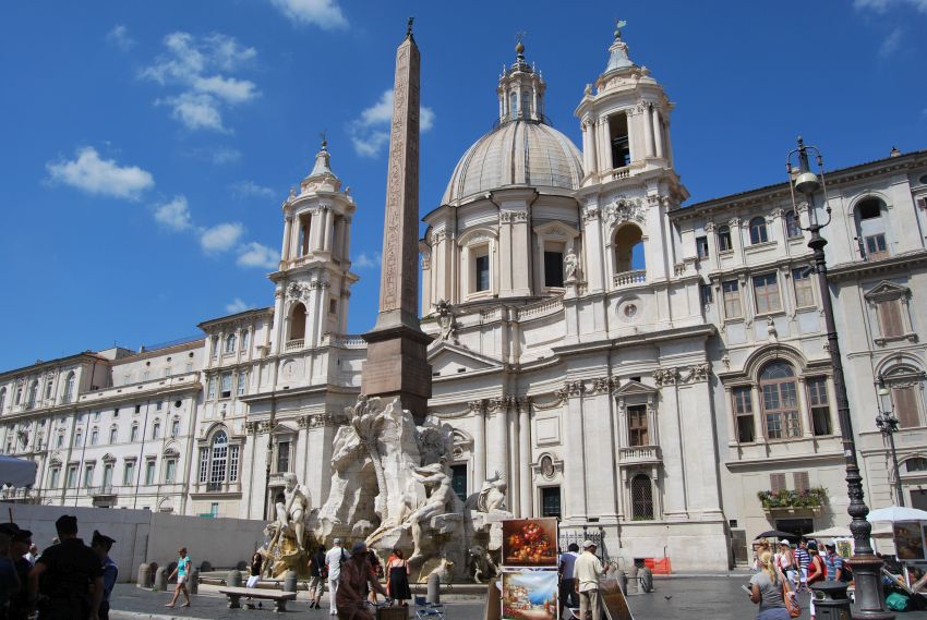 La plaza, única en su género, debe su forma a la antigua pista de carreras del Estadio de Domiciano y destaca por su asombrosa decoración propia del barroco romano.