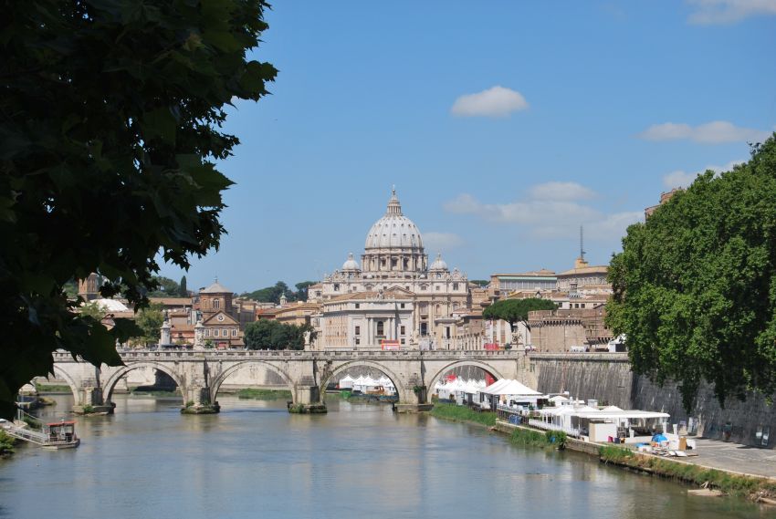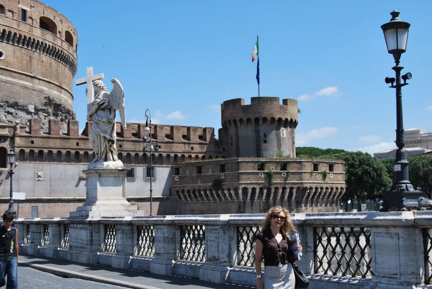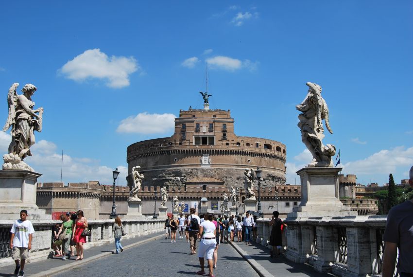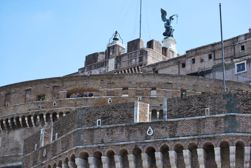 Bajamos hasta su orilla ascendiendo de nuevo a la altura del Ponte. S. Angelo, construido en el 134 aC por Adriano para acceder a su entonces Mausoleo, con balaustres y estatuas de la escuela de Bernini. Lo cruzamos para contemplar el Castillo del Santo Ángel, coronado por el célebre Arcángel en bronce de Werschaaffelt.