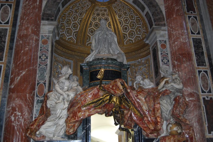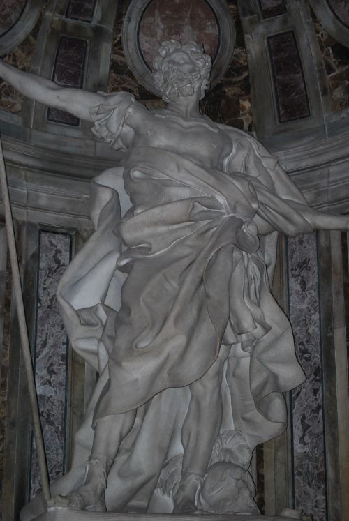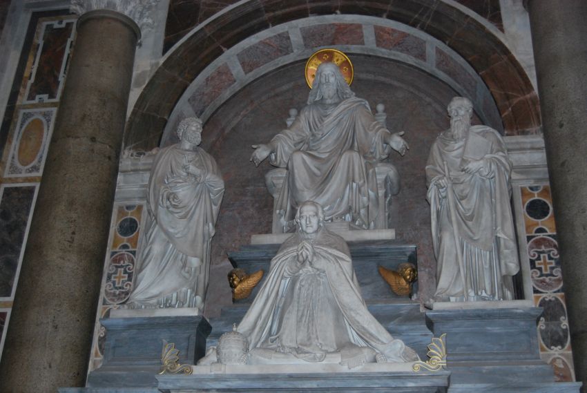 Sosteniendo la majestuosa Cúpula, también de Miguel Ángel, cuatro pilastras con cuatro grandes estatuas. Destaca la de San Longín, de Bernini, a cuya derecha está la célebre estatua en bronce de San Pedro.