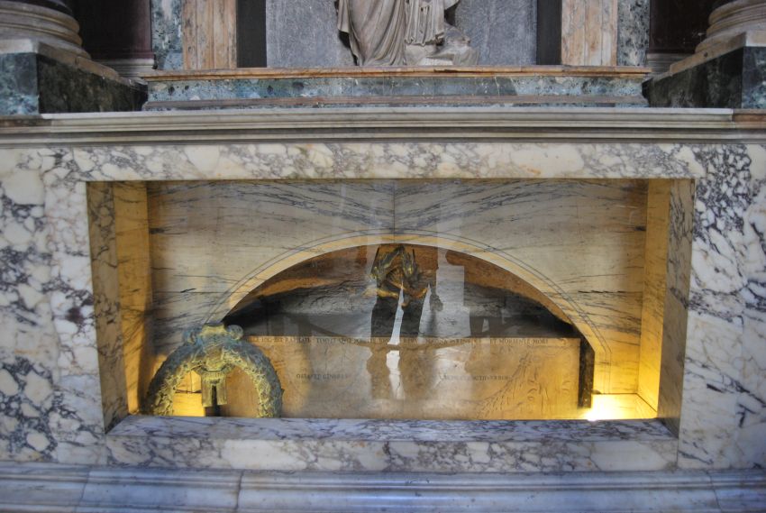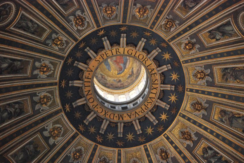 Sosteniendo la majestuosa Cúpula, también de Miguel Ángel, cuatro pilastras con cuatro grandes estatuas. Destaca la de San Longín, de Bernini, a cuya derecha está la célebre estatua en bronce de San Pedro.