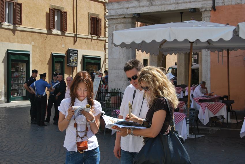 Tras visitar la iglesia de Sant’Agnese in Agone, construida en el lugar donde, según la tradición, la virgen, desnudada antes del martirio, fue envuelta por los bellísimos cabellos crecidos milagrosamente, May, Iku y Valentín buscaban en el plano el mejor camino para llegar a la plaza de San Pedro.