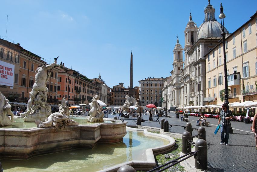 La plaza, única en su género, debe su forma a la antigua pista de carreras del Estadio de Domiciano y destaca por su asombrosa decoración propia del barroco romano.
