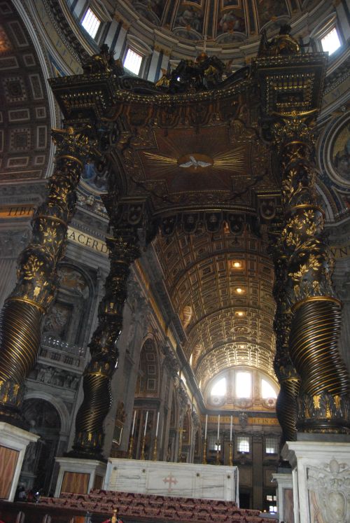 Sobre el altar mayor, se eleva el fantástico Baldaquino de Bernini, sostenido por cuatro columnas en forma de espirar, hecho con el bronce sacado del Panteón. Debajo de esta altar se halla la tumba de San Pedro. Detrás, la Cátedra de San Pedro, en la que se incluye la antigua silla de madera de la primera basílica, identificada, gracias a estudios recientes, como el trono de Constantino.