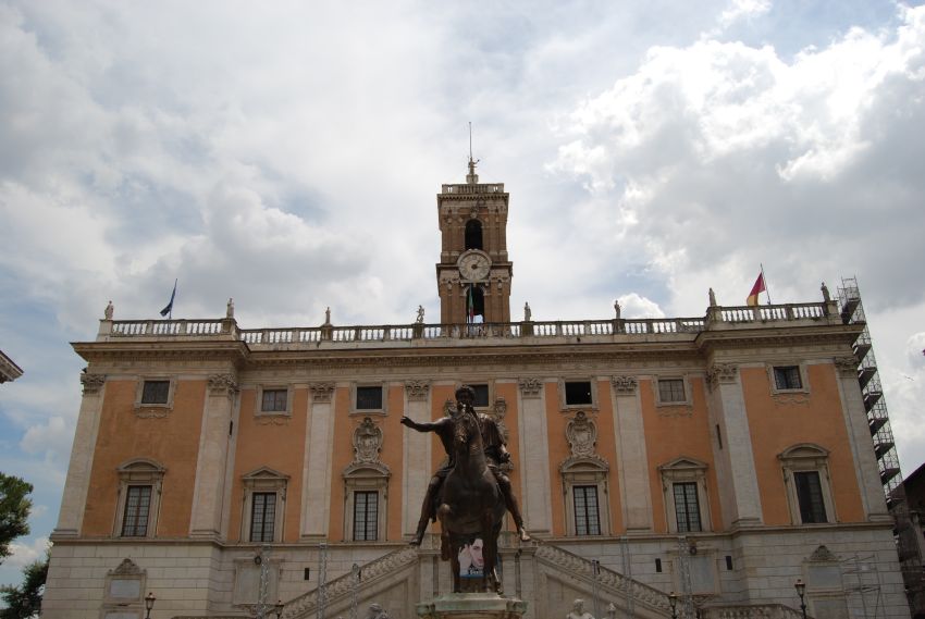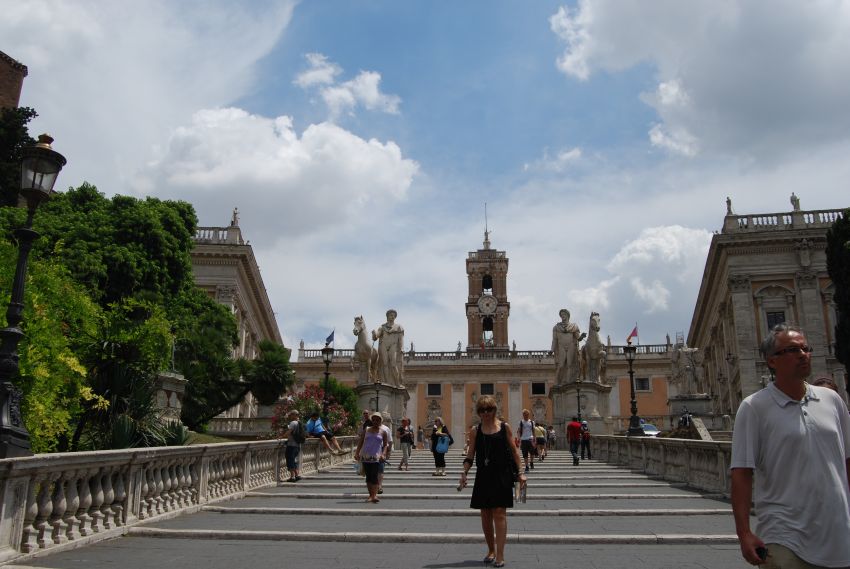 A la salida del foro nos esperaba el Capitolio, dedicado en el pasado a los dioses de Roma y meta de las entradas triunfales de los generales victoriosos, hoy sede del ayuntamiento de Roma. La plaza del Capitolio fue diseñada por Miguel Ángel para el Papa Pablo III. El Palacio Senatorio, al fondo de la plaza, fue construido sobre las antiguas ruinas del Tabularium. Salimos de la plaza por la impresionante y magnífica escalera, llamada Cordonata, realizada según los planos que Miguel Ángel ideó para la entrada triunfal del emperador Carlos V, en 1.536.
