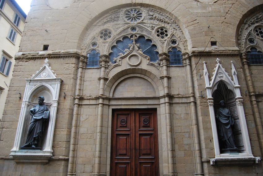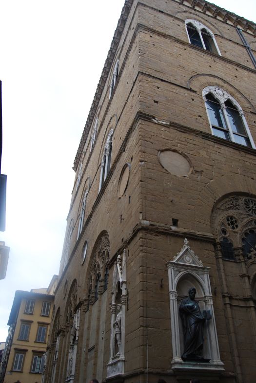 Atravesando por última vez la Piazzale degli Uffizi volvimos a la Piazza della Signoria y por la Via dei Calzaiuoli llegamos a la Iglesia de Orsanmichele (San Miguel del Huerto). Un monasterio carolingio denominado San Michele in Orto ocupaba en el siglo VIII el lugar donde se alza este edificio de planta cuadrangular y dos pisos. En 1290 Arnolfo di Cambio era el encargado de levantar la Logia de los Granos que estaba destinada a servir de granero en caso de carestía o sitio de la ciudad. El nuevo edificio fue destruido casi por completo, víctima de un incendio, por lo que se construyó una nueva logia en 1337, siendo Talenti el encargado de los trabajos, en colaboración con Neri di Fioravante y Benci di Cione.