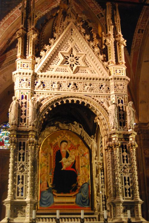 En el interior el espacio está dividido en dos naves, ubicándose en la derecha el ciborio de Andrea Orcagna, admirable obra de inspiración gótica realizado en mármol con lapislázuli y mosaico de oro, tabernáculo que cobijaba la imagen milagrosa de la Virgen, pintura que fue destruida por el fuego y sustituida por la actual Madonna delle Grazie, realizada en 1366 por Bernardo Daddi.