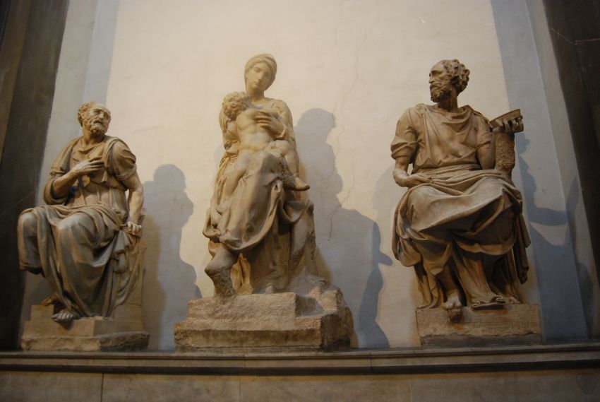 La única decoración del conjunto, a excepción de las tumbas, se encuentra en la Virgen con el Niño, grupo escultórico también realizado por Miguel Angel ocupando actualmente el lugar del sepulcro de los «Magnifici«, acompañada por las estatuas de los santos patrones de la familia Médici: San Cosme a la derecha, obra de Montorsoli (1537) y San Damián a la izquierda, realizado por Raffaele da Montelupo (1531).