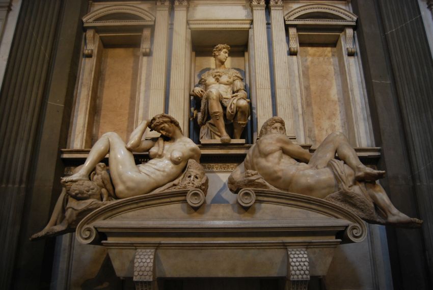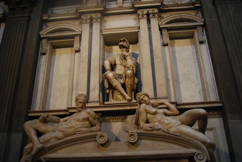 Enfrente se encuentra la tumba de Giuliano, el triunfo de la vida, representado con su coraza y su bastón de mando; a sus pies se encuentran representadas las alegoría de la Noche y el Día.