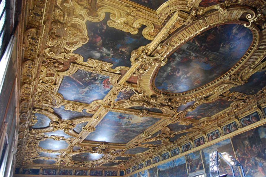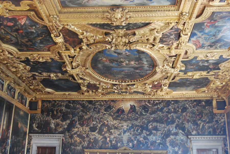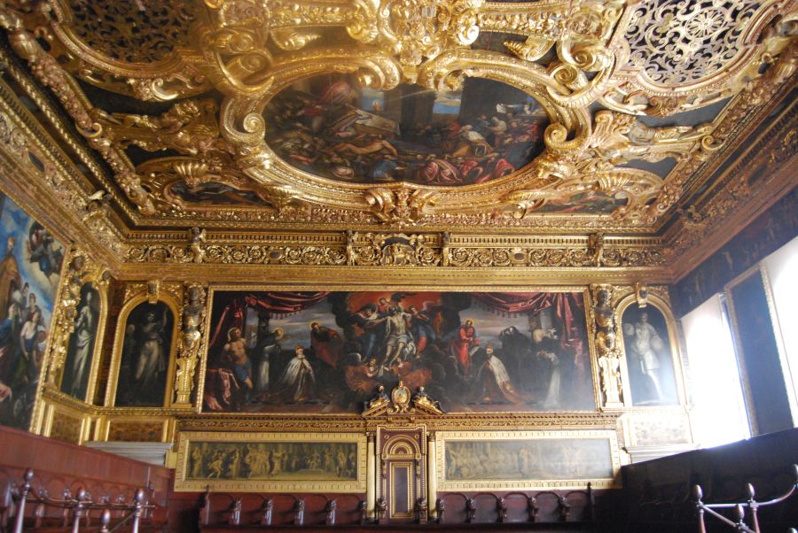 Reconstruido después del incendio de 1577 en el que murió de un ataque al corazón el dux Sebastiano Venier, el salón fue decorado por artistas como Veronés, Bassano, Palma el Joven y Tintoretto, autor de Paraíso, el cuadro al óleo más grande del mundo.