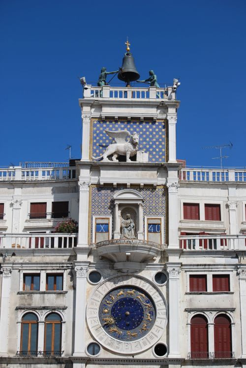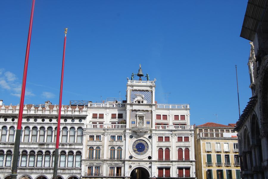 Al salir del Palacio Ducal ya se había iniciado el horario de visita de la basílica, algo que pudimos comprobar rápidamente por la cola que se había formado ante su puerta principal. Mientras esperábamos a entrar pudimos observar la Torre dell’Orologio. Mauro Codussi será el encargado de su construcción, entre los años 1496 y 1499. La parte inferior del edificio está constituida por un arco de triunfo sobre el que se encuentra el reloj que marca las horas, las fases solares y lunares y los signos del zodiaco. Sobre el reloj se abre una hornacina que guarda la estatua en bronce de la Virgen. El león de san Marcos ocupa la parte superior de la torre, ante una pared decorada con piedras azules y doradas que asemeja un cielo estrellado.