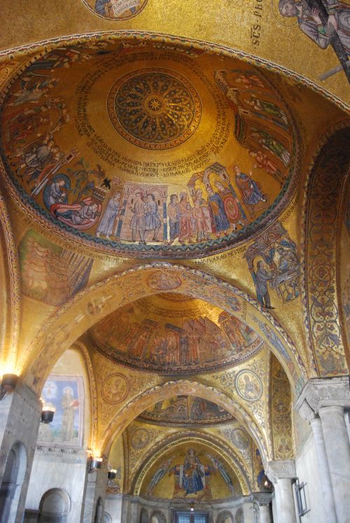 Dentro de la basílica, fundamentalmente bizantina en su concepción arquitectónica, lucen los mosaicos, que son su elemento decorativo natural. En éstos se representan historias basadas en la Biblia, figuras alegóricas, acontecimientos de la vida de Cristo, de la Virgen, de San Marcos y de otros santos. Los mosaicos, en los que predomina el oro, revisten por más de 8.000 metros cuadrados las paredes, las bóvedas y las cúpulas.