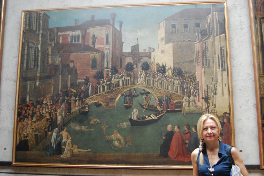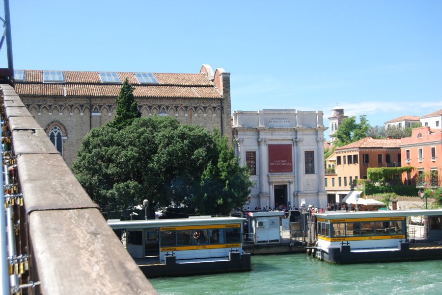Encaminamos nuestros pasos hacia las Galerías de la Academia, conjunto monumental sede de la Escuela Grande de Santa María de la Caridad, una de las cofradías laicas más antiguas de Venecia. Forman parte de ella también la iglesia del mismo nombre, Santa María, y el monasterio de los canónicos Lateranenses, realizado por Andrea Palladio.