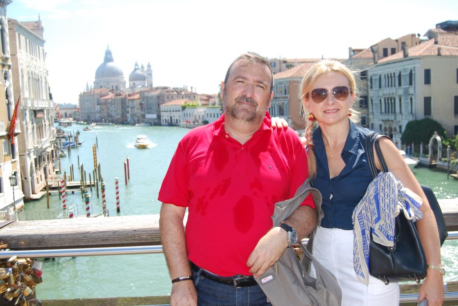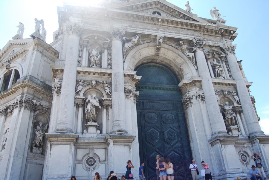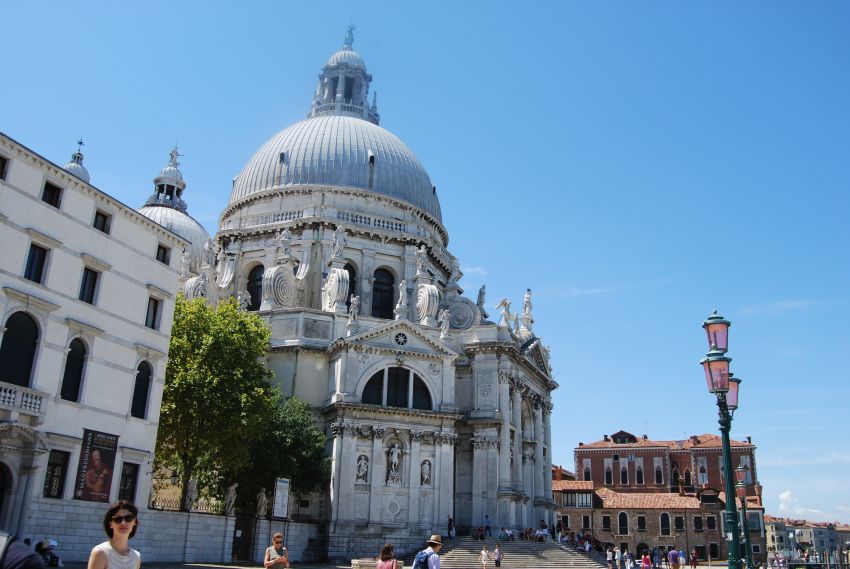 Nos encontrábamos ahora frente a la Iglesia de Santa María de la Salud. Venecia fue atacada varias veces, y con resultados desastrosos, por terribles pestes. Con ocasión de la epidemia de 1630 los venecianos prometieron a la Virgen que construirían en su honor una iglesia, a cambio de la salvación. En 1631, cesada la peste, se erigió esta iglesia, según el proyecto de Baldassarre Longhena.