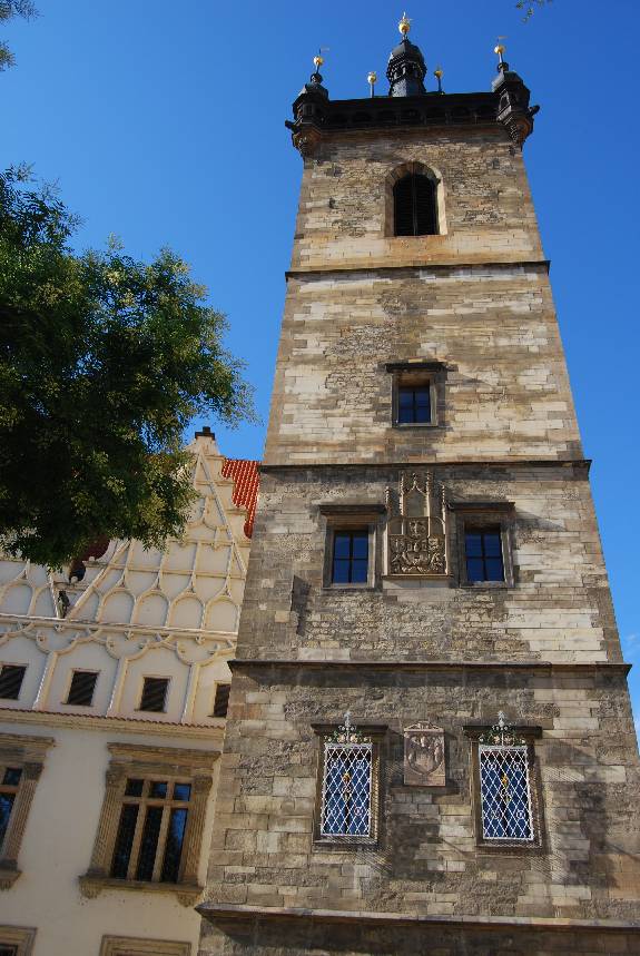En la parte derecha de la Plaza, en el extremo norte, pudimos contemplar el Ayuntamiento de la Ciudad Nueva (Novoměstská radnice). El Ayuntamiento, que se construyó entre 1377 hasta 1419, fue testigo de la primera defenestración de Praga en 1419, cuando varios representantes municipales católicos fueron lanzados por una de sus ventanas. Este hecho desencadenó las guerras husitas, entre protestantes y católicos. Estuvo en funcionamiento hasta 1784.