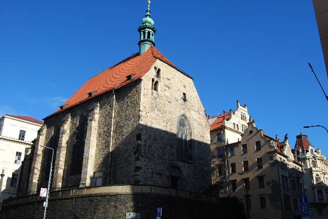 A nuestra izquierda, la Iglesia de San Wenceslao en Zderaza (Kostel svatého Vaclava Na Zderaze), en la esquina de la calle Resslova con la calle Dittrichova. Zderaz es el nombre que recibía esta zona de la Ciudad Nueva cercana al río. Los edificios que existían se demolieron en el Saneamiento del año 1900 y sólo se ha conservado esta iglesia. De estilo gótico, se construyó en 1380 sobre una antigua edificación románica y consta de una sola nave. En 1785 se convirtió en almacén militar. En 1927 el edificio fue adquirido por la Iglesia Checoslovaca, heredera de las ideas de Jan Huss, por tanto, protestante. En su interior destaca el altar con el crucifijo, realizado por el famoso escultor checo František Bílek en 1930.