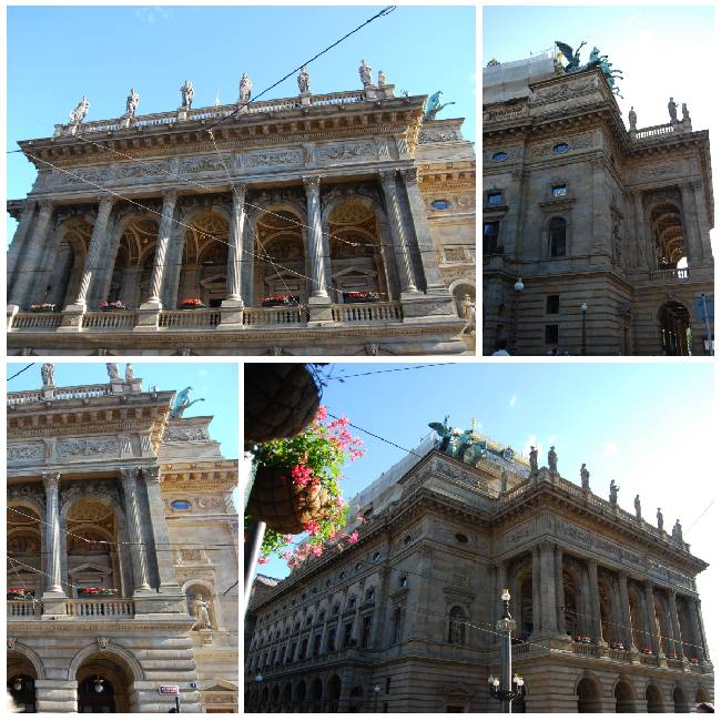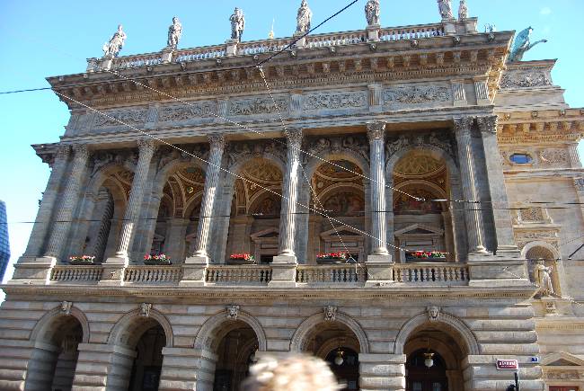 Unos minutos después comenzó a llover con menor intensidad. Ya se podía incluso pasear. Llegamos a Vrchlického sady, y allí nos encontramos con la estación de ferrocarril que tres días más tarde nos conduciría a nuestro siguiente destino. Continuando por este parque nos encontramos con la Ópera estatal, que ocupa el lugar donde se había construido el primer teatro de la Ciudad Nueva y que fue derruido en 1865. Su nombre original fue Nuevo Teatro Alemán y se construyó para rivalizar con el Teatro Nacional Checo, que está en la Avenida Nacional. Su fachada es neoclásica y destaca el friso. Hoy en día es el principal teatro operístico de la ciudad de Praga.