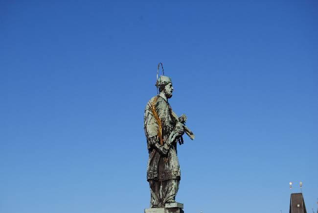 Detallaremos ahora el octavo grupo escultórico a la derecha: San Juan Nepomuceno, obra de Jan Brokoff (1683). Dice la leyenda que el santo era confesor del rey Wenceslao IV y que éste le exigió que le revelara una confesión que le había hecho su esposa la reina. Juan Nepomuceno, por supuesto, se negó a romper el secreto de confesión y el rey mandó arrojarlo al río desde el Puente en 1393.