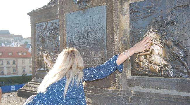 El lugar desde donde parece que fue lanzado a las aguas del Vltava está señalado por una cruz arzobispal de latón colocada en la barandilla y por lo visto, Juan Nepomuceno sobrevivió. Por eso la leyenda dice que si se toca la cruz de manera que cada uno de los dedos toque una estrella, da suerte. La estatua tiene un bajorelieve en el que se narra precisamente esta leyenda.
