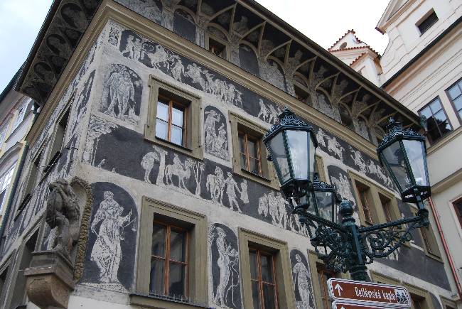 El edificio de la derecha es la Casa de la mesa de piedra, con su fachada en tono anaranjado. La siguiente casa, con la fachada de color verde pálido, actualmente es un hotel. La siguiente casa, justo en la esquina con la calle Železná, es la Casa del caballito blanco, y en su interior conserva elementos románicos y góticos. La casa también se conoce como Escuela Smetana, ya que era la sede de la escuela de pianistas que fundó el famoso compositor checo.