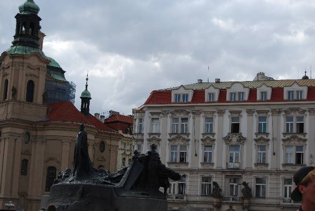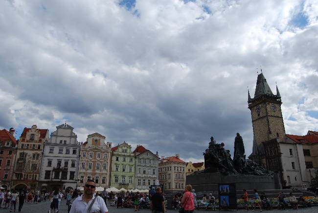En el centro de la plaza encontramos un monumento altamente simbólico, el dedicado al reformador Jan Hus, iniciador del movimiento nacionalista protestante de los husitas. Hus se enfrentó con el poder establecido, el del rey y el de la Iglesia Católica, y fue quemado en la hoguera. El monumento, obra de Ladislav Saloun, se construyó en 1915, Bohemia todavía formaba parte del Imperio Austro-Húngaro, como símbolo de reafirmación nacional.