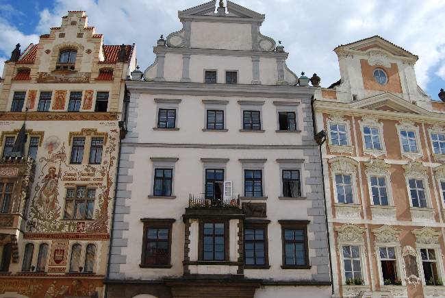 En cuanto a los edificios de la parte sur, la primera casa por la izquierda, con la fachada en tono salmón, es la Casa del unicornio blanco, de principios del siglo XVIII, que fue conocida popularmente por ese nombre porque allí había una farmacia llamada Del Unicornio blanco. La siguiente casa hacia la derecha es posiblemente la que llama más la atención, la Casa Storch y fue construida a finales del siglo XIX. En su fachada destacan los frescos pintados por Mikulas Aleš.