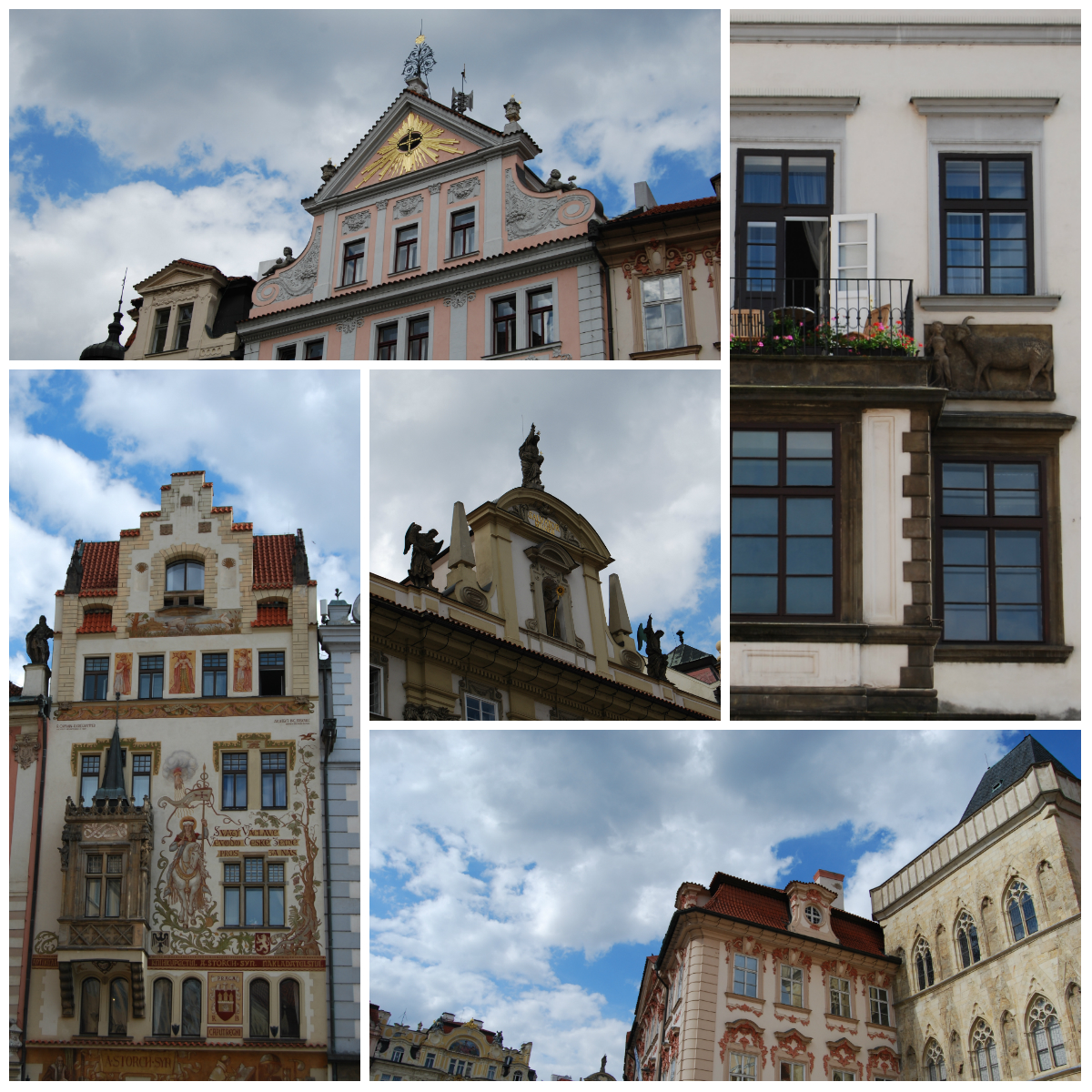 La casa más antigua de la parte norte es la de la derecha, que se construyó en el siglo XVII en el lugar donde había existido un antiguo convento. El resto de edificios son de principios del siglo XX y se construyeron tomando una parte del antiguo Barrio Judío cuando se produjo el Saneamiento. La siguiente a la izquierda, con la fachada pintada de amarillo y rosa (es un solo edificio) se construyó en 1900 y era la sede de la Compañía de Seguros de Praga. En la parte pintada de rosa se intentó respetar el estilo barroco de la casa original, mientras que la parte pintada de amarillo corresponde al estilo art nouveau, propio de finales del XIX y principios del XX. El edificio que hace esquina con la calle Parizšká se construyó a principios de siglo, pero en estilo barroco, intentando reproducir también el edificio originario. Aquí pudimos ver también la Casa natal de Franz Kafka.