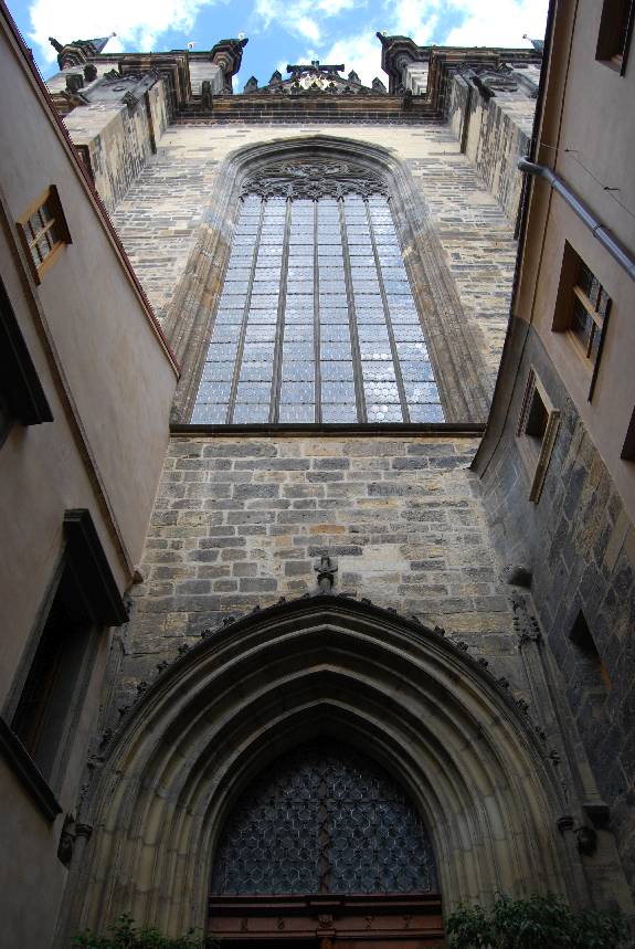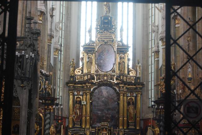 A destacar el tímpano sobre el portal de la iglesia. El que podemos contemplar actualmente es una copia del que realizó el constructor y arquitecto de la corte de Carlos IV, Petr Parlér, que era de finales del siglo XIV.
