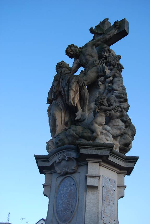 El decimosegundo grupo escultórico a la izquierda -Santa Luitgarda, obra de Matyás Braun (1710)-; el decimocuarto grupo escultórico a la izquierda -Santos Juan de Malta, Félix de Valois e Iván, obra de Ferdinand Brokoff (1714)-; el decimocuarto grupo escultórico a la derecha -San Vito, obra de Ferdinand Brokoff (1714)-; el decimoquinto grupo escultórico a la derecha -Santos Salvador, Cosme y Damián, obra de Jan Oldřich Mayer (1709)- y el decimoquinto grupo escultórico a la izquierda -San Wenceslao, obra de Josef Böhm (1858).
