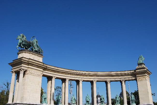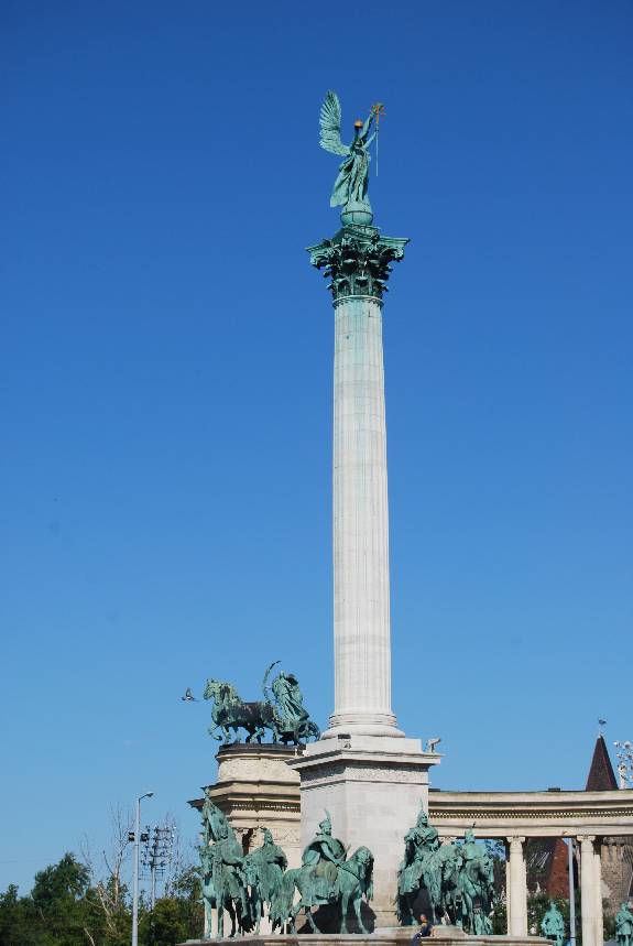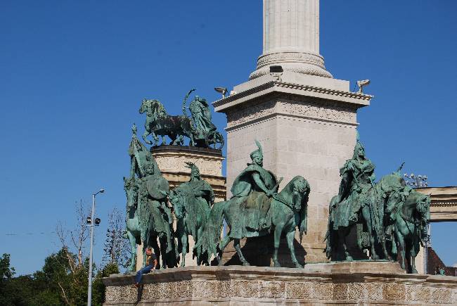 En el centro se ven las figuras ecuestres de los siete jefes que condujeron las siete tribus húngaras en el año 896 a.c. desde la antigua patria asiática hasta la cuenca de los Cárpatos. Los dos arcos constituidos por columnas abrazan un espacio de 85 metros de largo y entre las columnas vimos esculturas de reyes, príncipes de Transilvania y gobernadores húngaros.