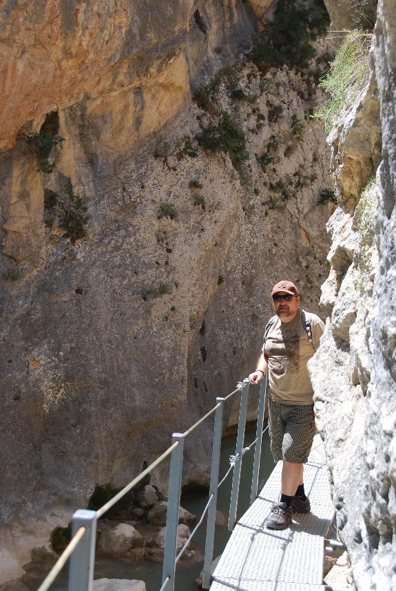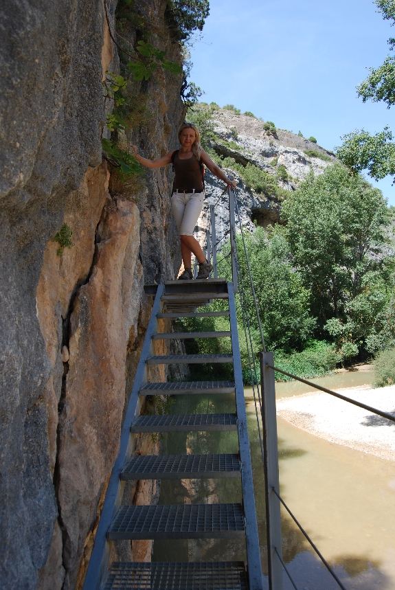 Pronto, encontramos las primeras pasarelas de madera que bajan encajonadas entre la Peña Castibián, a la izquierda, y los Muros de la Colegiata, a la derecha. Un total de siete tramos de pasarelas facilitan el descenso hasta el Vero.