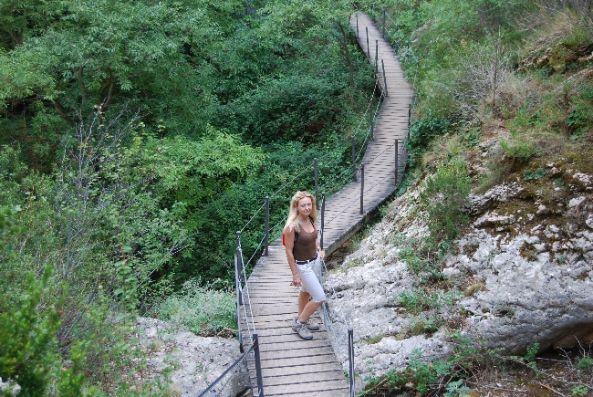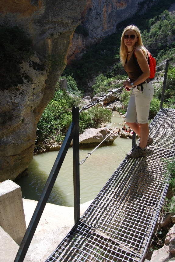 El camino prosigue río abajo, a través de una espectacular pasarela metálica instalada en la pared rocosa. Más tarde encontramos la vieja presa y, tras recorrer un nuevo tramo de pasarelas metálicas, la antigua central hidroeléctrica de Alquézar. Una badina de un profundo azul turquesa invita al baño y al descanso.
