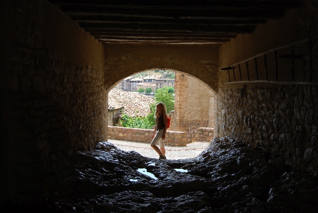 Para llegar al inicio de la ruta de las Pasarelas del Vero paseamos por la Calle Pedro Arnal Cavero, antiguamente llamada Calle Mayor, que nos introduce en el conjunto medieval de Alquézar. Es uno de los tres ejes vertebrales que recorren longitudinalmente el pueblo, al que derivan otras calles transversales más estrechas y escalonadas permitiendo una comunicación más fluida a los diferentes puntos del pueblo.