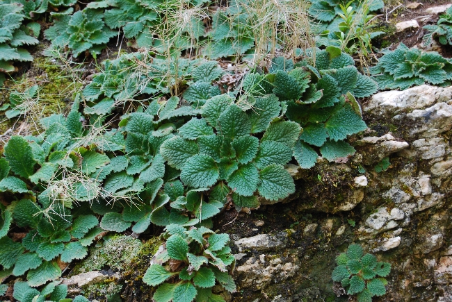 Es una planta herbácea con las hojas, densamente pilosas y sésiles, se disponen en una roseta basal. Las hojas son ovales a elípticas-espatuladas, contundentes con grueso borde serrado con muescas y arrugas en la parte inferior.