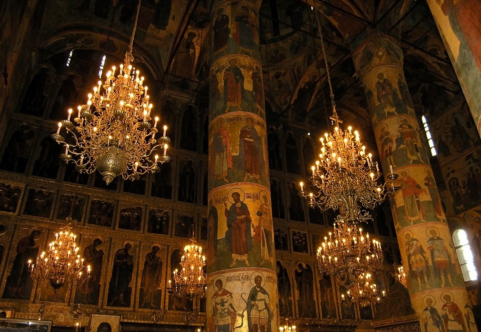 Interior of the cathedral of Assumtion (Uspensky Sobor), the main church of Moscow Kremlin and the Russian State for period of 500 years. The magnificent cathedral has beautiful large chandeliers (also called as panikadilo in Ortdodox church) and the round pillars (feature of Italian architecture) with depictions of multitudinous martyrs, who do support the Church by their lives and death just like pillars support the vault.