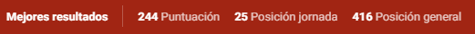 Los «Mejores resultados» muestran una puntuación máxima de 244,0 puntos; un 25º puesto como mejor posición en una jornada (en la jornada 37) y un puesto 416º como mejor posición en la clasificación general.