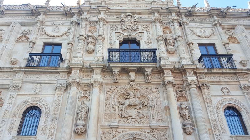 Su fachada es una perla del plateresco español. Es de un solo lienzo con muro de dos cuerpos y dos pisos, rematado en crestería calada y candeleros. El primer cuerpo posee ventanas de medio punto y pilastras platerescas, el segundo balcones y columnas con balaustradas. En el zócalo se presenta medallones con personajes greco-latinos y de la Historia de España. En el sobre zócalo se representan cabezas de ángeles.