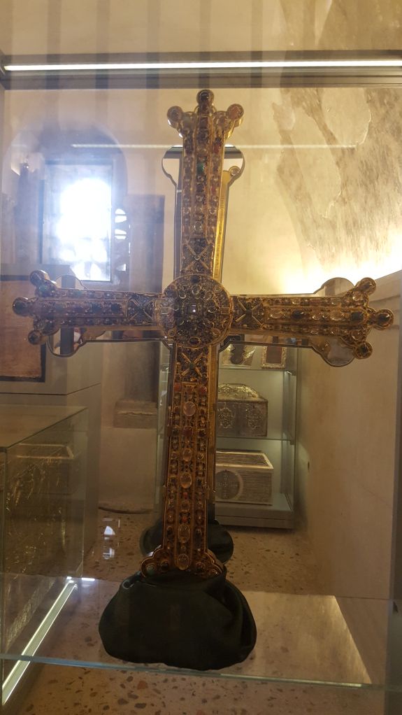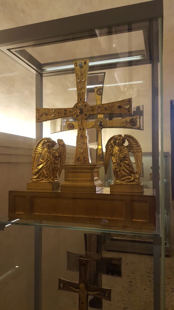 En la Cámara Santa se puede ver el tesoro de la catedral, en el que sobresale la Cruz de los Ángeles, donación de Alfonso II y símbolo de Oviedo. La Cruz de la Victoria, donación de Alfonso III, símbolo de Asturias. La Caja de las Ágatas, donación de Fruela II (910); y el Arca Santa, en la que se encuentra el Santo Sudario que, según la tradición, es la tela que fue colocada sobre el rostro de Jesucristo en la cruz.