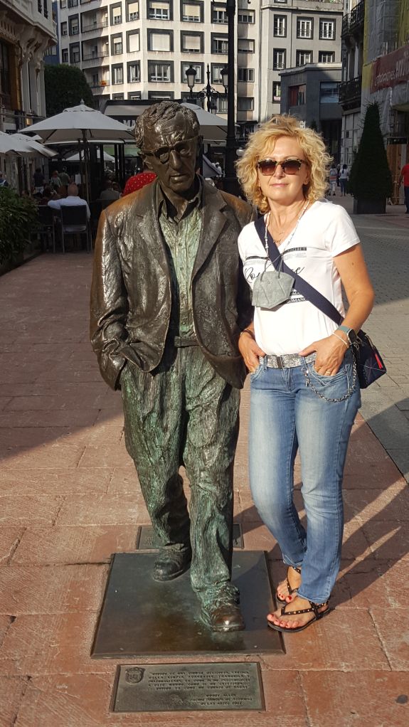 En la calle Uría, en el principio de la calle Milicias Nacionales, encontramos una de las esculturas de bronce más fotografiada de la ciudad, la que rinde homenaje a Woody Allen, Premio Príncipe de Asturias de las Artes en el año 2002, obra de Vicente Menéndez-Santarúa.