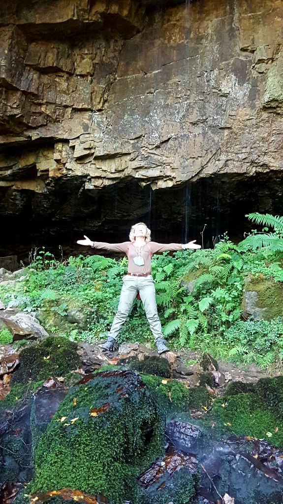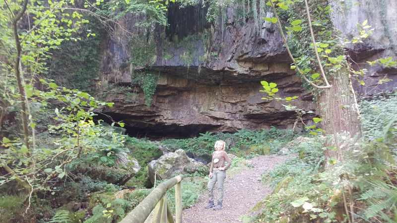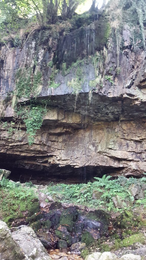 Tras ascender unos escasos 50 metros por una pequeña cuesta aparece, escondida, una cueva tras una pequeña cascada, que cae por delante de ella y a la que puedes entrar para ver el agua caer desde el otro lado.