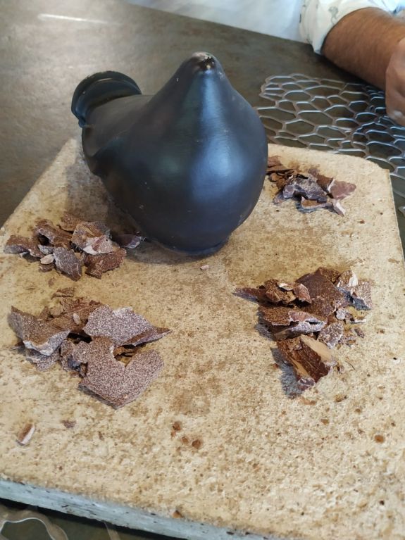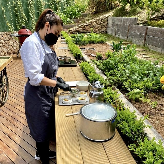 Del jardín pasamos al huerto. En él se elabora en el huerto un plato denominado se llama verduras en modo ancestral. Se comienza sacando del barro una calabaza que se ha asado cubierta de él. Una oreja de cerdo glaseada, verduras que salen de debajo de la tierra, nitrógeno líquido… Una preparación para ser admirada y para disfrutar finalmente del sabor de ese plato.
